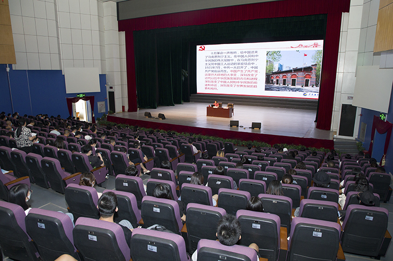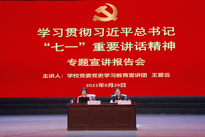 9月29日下午,a片漫画 在实验剧场举行学习贯彻习近平总书记“七一”重要讲话精神专题宣讲报告会,全体教职工和学生党员共200余人参加学习。报告会由学校党委党史学习教育宣讲团成员、马克思主义学院王爱云教授主讲,学院党委书记冯红爱主持。