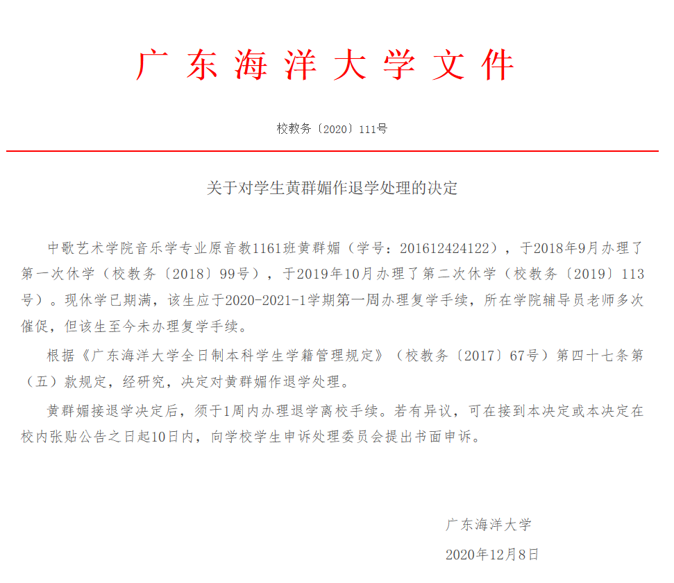 关于对学生黄群媚作退学处理的决定