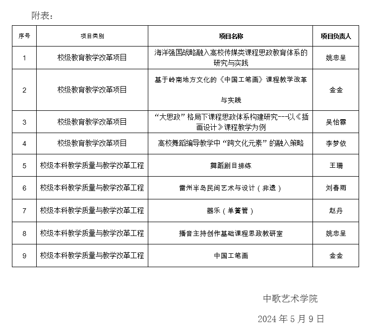 根据《关于开展2024年度校级本科教学质量与教学改革工程项目申报工作的通知》(校教务〔2024〕36号)、《关于组织申报2024年校级教育教学改革项目的通知》(校教务〔2024〕37号)的文件要求,学院认真组织资格审核和评审推荐,经评审专家(院内3人,校外2人)集体讨论通过,同意向学校推荐姚忠呈等共9个教师团队申报校级项目(详情见附表),现予公示。