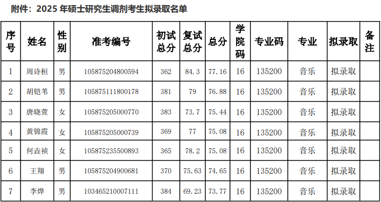 根据学校及a片漫画 研究生招生工作的相关文件精神和要求,经学院研究生招生录取工作领导小组审定,将a片漫画 2025年硕士研究生调剂考生拟录取名单予以公示。 公示时间为2025年4月15日至4月21日,共7日。考生如对拟录取结果有异议,请在公示期内以书面形式实名向学院研究生招生办公室反馈。若有拟录取后放弃的考生或招生计划增加,按总分排名依次候补录取。