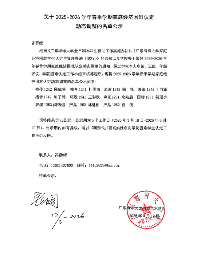 关于2025-2026学年春季学期家庭经济困难认定动态调整的名单公示