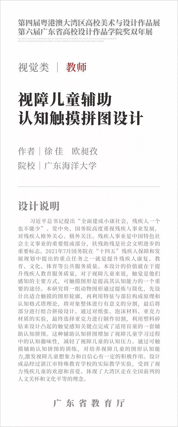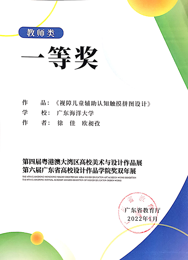 获奖作品《视障儿童辅助认知触摸拼图设计》,致力于通过无障碍设计促进我国视障儿童教育的SDGs目标实现,充分展示了学院在培养人才、服务社会方面取得的成果。学院将以此为契机,强化使命担当,坚定文化自信,继续深化专业教学与社会需求的融合创新,探索新时代教育服务社会的新模式,为粤港澳大湾区建设培养更多的优秀设计人才。