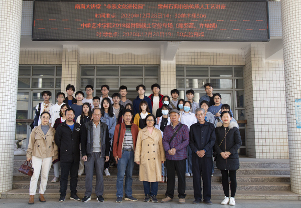 讲座以国家非遗雷州石狗雕刻活态传承为主要内容。吴其林,叶美三,陈应葵三位雷州石狗非遗传承人为海大学子现场讲授,详细介绍了雷州石狗雕刻的具体步骤和方法,包括从设计图稿到捏坯(泥土),从选材(玄武岩)、劈出块面到协调头、身、腿、足等比例、从去粗坯到细刻脸部、五官、身躯、脚部、附着纹饰到最后点花的全部制作过程。通过手把手教学、面对面互动,同学们热情积极参与,学习了传统雕塑造型的思路和技法,对于雷州石狗有了初步的了解,设计出了不少具有个性的石狗造型,启发并拓宽了设计学习的视野。