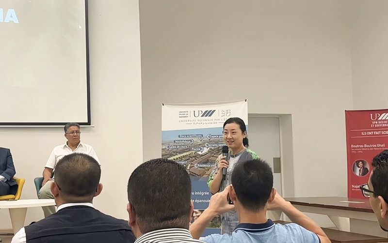 严嘉老师发言,马拉喀什私立大学校方对我校规模及学科建设表示赞叹。