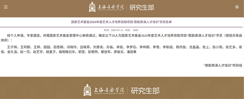 国家艺术基金是经国务院批准,由国家设立,旨在繁荣艺术创作,培养艺术人才,打造和推广精品力作,推进艺术事业健康发展的公益性基金。由上海音乐学院作为主体实施单位的国家艺术基金2024年度艺术人才培训资助项日“歌剧表演人才培训”坚持以习近平新时代中国特色社会主义思想为指引,深入学习贯彻党的二十大精神,始终坚持立德树人根本任务,进一步贯彻落实习近平总书记关于文艺工作的重要论述精神,以人民为中心,为大力繁荣新时代中国特色社会主义文化贡献力量。