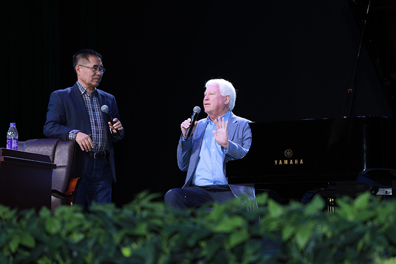 专题讲座中,约翰,赛尔文教授以“巴赫与爵士”为主题,结合自身演奏经历,详细解析了不同风格音乐作品的处理技巧,强调“音乐没有边界,重要的是用真诚的情感传递作品内涵”。他通过幽默的讲述和多次示范以及我校学生的积极参与,让在场的听众了解了爵士乐的基础知识和即兴演奏的创意和演奏方式、方法,让观看讲座的听众深深地沉浸在黑白琴键交织和古典与爵士乐轮回的旋律中,感受到了世界著名钢琴家讲课时的魅力。在互动环节,听众踊跃提问,从“如何平衡古典演奏的规范性与爵士的即兴性”到“新手钢琴学习的进阶方法”,他都耐心解答,并现场示范演奏技巧,让在场音乐爱好者受益匪浅。